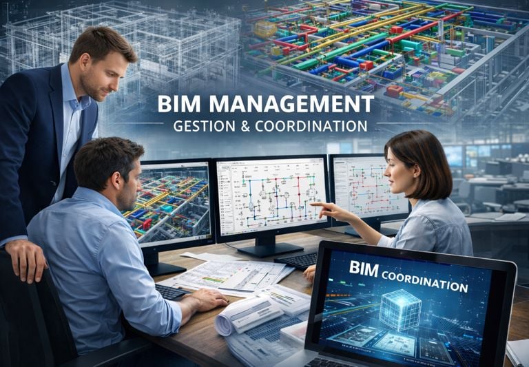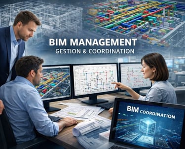 Nos missions incluent la structuration des maquettes, la définition des conventions BIM, la coordination multi-lots, la gestion des données techniques et la production de DOE numériques.